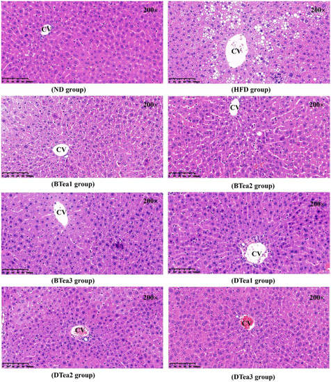 The histopathologic evaluations in hepatic tissue stained with haematoxylin and eosin (H&E) for all groups (magnification: 200, scale bar: 100 µm). ND, the control group (normal diet group); HFD, the model group (high-fat diet group); BTea1, selenium-enriched black tea; BTea2, Dianhong tea; BTea3, Yingde black tea; DTea1, Fu brick tea; DTea2, Liupao tea; DTea3, selenium-enriched dark tea.