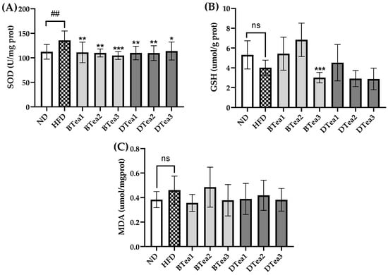 The effects of different black and dark teas on liver oxidative injury. (A) superoxide dismutase (SOD); (B) glutathione (GSH); (C) malondialdehyde (MDA). The results are expressed as mean ± standard deviation. ND, the control group (normal diet group); HFD, the model group (high-fat diet group); BTea1, selenium-enriched black tea; BTea2, Dianhong tea; BTea3, Yingde black tea; DTea1, Fu brick tea; DTea2, Liupao tea; DTea3, selenium-enriched dark tea. ## p < 0.01, the HFD group compared with the ND group; * p < 0.05, ** p < 0.01, *** p < 0.001, the tea extract supplementary groups compared with the HFD group. ns, no statistically significant differences (p > 0.05) between the model group and the control group.
