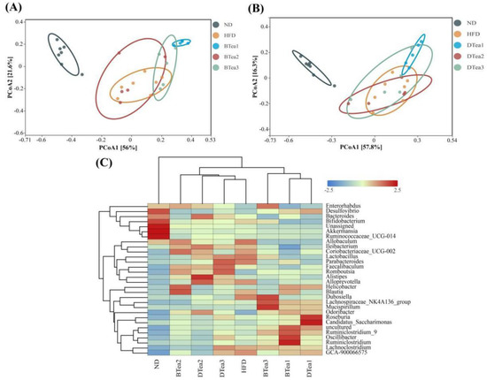 The effects of different black and dark teas on the gut microbiota structure. (A) PCoA analysis among ND, HFD and black teas groups; (B) PCoA analysis among ND, HFD and dark teas groups; (C) species abundance cluster analysis at the genus level. ND, the control group (normal diet group); HFD, the model group (high-fat diet group); BTea1, selenium-enriched black tea; BTea2, Dianhong tea; BTea3, Yingde black tea; DTea1, Fu brick tea; DTea2, Liupao tea; DTea3, selenium-enriched dark tea.
