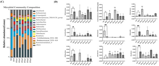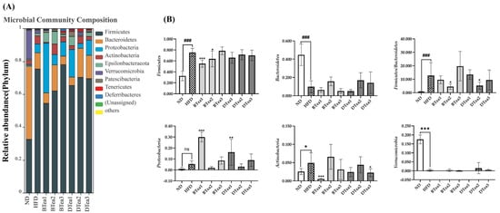 The effects of different black and dark teas on the gut microbiota composition at the phylum and genus levels. (A) Relative abundance of the gut microbial profile at the phylum level among all groups; (B) relative abundance of Firmicutes, Bacteroidetes, the ratio of Firmicutes and Bacteroidetes, Proteobacteria, Actinobacteria and Verrucomicrobia among all groups; (C) relative abundance of the gut microbial profile at the genus level among all groups; (D) relative abundance of Ileibacterium, Lachnospiraceae_NK4A136_group, Helicobacter, Lactobacillus, Akkermansia, Dubosiella, Allobaculum, Odoribacter and Roseburia among all groups. The results are expressed as mean ± standard deviation. ND, the control group (normal diet group); HFD, the model group (high-fat diet group); BTea1, selenium-enriched black tea; BTea2, Dianhong tea; BTea3, Yingde black tea; DTea1, Fu brick tea; DTea2, Liupao Tea; DTea3, selenium-enriched dark tea. # p < 0.05, ## p < 0.01, ### p < 0.001, the HFD group compared with the ND group; * p < 0.05, ** p < 0.01, *** p < 0.001, the tea extract supplementary groups compared with the HFD group. ns, no statistically significant differences (p > 0.05) between the model group and the control group.