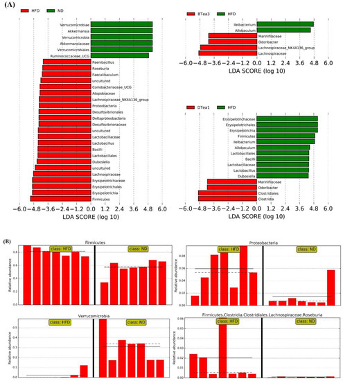 Linear discriminant analysis (LDA) effect size (LEfSe) analysis was also performed to investigate the differential enrichment in the intestinal microbiota among the control, HFD and all tea extracts supplementary groups ranging from phylum to genus levels. The taxonomic branching plot was produced by using LEfSe analysis of 16S rRNA sequences as shown in Figure 9A, with the bars indicating the effect size for each taxon between the HFD group and ND, Yingde black tea (BTea3) and Fu brick tea (DTea1) groups, respectively. In addition, certain strains including Firmicutes, Proteobacteria, Verrucomicrobia, and Roseburia, that significantly differed between the HFD and control groups, have been displayed in the significantly different strain content graph (Figure 9B). Different enrichment of specific bacteria was observed in both histograms and differential strain content plots, with HFD resulting in a significant alteration in the intestinal microbiota. Compared with the ND group, the Firmicutes phylum, Erysipelotrichia class, Erysipelotrichales order, Erysipelotrichaceae family, Faecalibaculum genus, Dubosiella genus, Lachnospiraceae family, Roseburia genus, Bacilli class, Lactobacillales order, Lactobacillaceae family, Lactobacillus genus, Proteobacteria phylum, Deltaproteobacteria class, Desulfovibrionales order, and Desulfovibrionaceae family were enriched in HFD group. However, the supplementation of different black teas and dark teas could partly reverse the shift in gut microbiota induced by HFD feeding. In summary, the intervention of different black and dark tea extracts could effectively attenuate HFD-induced NAFLD through modifying the gut microbiota communities at varying degrees.