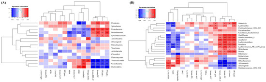 Correlations between the relative abundance of gut microbiota at phylum (A) and genus (B) levels and NAFLD phenotypes induced by long-term HFD exposure. The NAFLD phenotypes included obesity characteristics, liver damage parameters and liver oxidative injuriers. Asterisk (*) indicates that the correlation between NAFLD phenotypes and the relative abundances of gut microbiota was statistically significant (* FDR < 0.05, ** FDR < 0.01). BW, body weight; EF index, the ratio of epididymal fat mass to body weight; PF index, the ratio of perirenal fat mass to body weight.