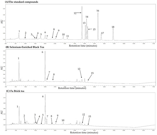 The HPLC chromatograms under 254 nm wavelength of the standard compounds (A), selenium-enriched black tea (B), and Fu brick tea (C). 1, gallic acid; 2, gallocatechin; 3, epigallocatechin; 4, catechin; 5, chlorogenic acid; 6, caffeine; 7, epigallocatechin gallate; 8, epicatechin; 9, gallocatechin gallate; 10, epicatechin gallate; 11, catechin gallate; 12, ellagic acid; 13, myricetin; 14, quercitrin; 15, astragalin; 16, quercetin; 17, theaflavin; 18, kaempferol.