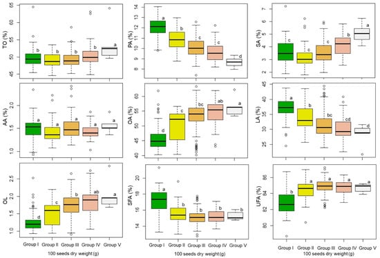 Total oil content, and individual and total fatty acid contents according to 100-seed weight groups. Group I, Group II, Group III, Group IV, and Group V represent the genotypes have a 100-SW of 25–45 g, 45–65 g, 65–85 g, 85–105 g, and 105–125 g, respectively. TO = total oil, PA = palmitic acid, SA = stearic acid, OA = oleic acid, LA = linoleic acid, AA = arachidic acid, OL = oleic acid to linoleic acid ratio, SFA = total saturated fatty acid, UFA = total unsaturated fatty acid. Different letters indicate significant differences between groups (p < 0.05).