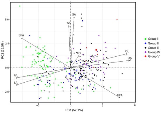 Principal component biplot for peanut accessions of the total oil content, and individual and total fatty acid contents, based on the entire dataset. Group I, Group II, Group III, Group IV, and Group V represent the genotypes have a 100-SW of 25–45 g, 45–65 g, 65–85 g, 85–105 g, and 105–125 g, respectively. TO = total oil, PA = palmitic acid, SA = stearic acid, OA = oleic acid, LA = linoleic acid, AA = arachidic acid, OL = oleic acid to linoleic acid ratio, SFA = total saturated fatty acid, UFA = total unsaturated fatty acid.