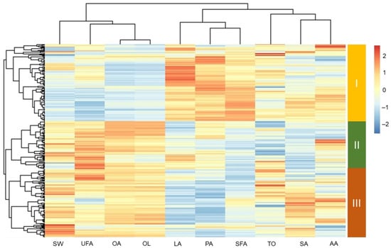 A hierarchical cluster analysis was conducted of the 100-seed weight, total oil content, and fatty acid profile using the whole dataset (Figure 3 and Table S4). A total of 301 accessions were classified into three clusters; the related peanut genotypes used in this study are listed in Table S5. The 100-seed weight, total oil content, oleic acid to linoleic acid ratio, and palmitic acid, stearic acid, oleic acid, linoleic acid, total saturated fatty acid, and total unsaturated fatty acid contents differed significantly among the three clusters, but there was no significant difference in arachidic acid content. Cluster I consisted of 120 accessions, and had the highest levels of palmitic acid, linoleic acid, and total saturated fatty acid. Cluster II contained 75 accessions and had the highest levels of total unsaturated fatty acid. Cluster III had 106 accessions and the highest 100-seed weight, total oil content, oleic acid to linoleic acid ratio, and stearic acid, arachidic acid, and oleic acid contents. Intriguingly, the 100-seed weight, oleic acid content, and oleic acid to linoleic acid ratio increased in the order of cluster I < cluster II < cluster III, while the linoleic acid and palmitic acid contents decreased in the order of cluster I > cluster II > cluster III. These relationships suggest that genotypes with a higher 100-seed weight may contain higher levels of oleic acid and lower levels of linoleic acid.