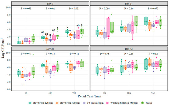 Psychrotrophic aerobic plate counts (Log CFU/cm2) on pork sections treated with different antimicrobials stored at four different dark storage periods (Day 1, 14, 28, and 42) and then cut into chops and retail displayed for 96 h at refrigerated conditions (n = 9 swabs per treatment/dark storage period/ retail display time). In each boxplot, the horizontal line crossing the box represents the median, the bottom and top box are the lower and upper quartiles, the vertical top line represents 1.5 times the interquartile range, and the vertical bottom line represents 1.5 times the lower interquartile range. (a–b) For each dark storage period and retail display time combination, boxes with different letters are significantly different according to Kruskal–Wallis analysis followed by a Wilcoxon’s pairwise comparison test at p < 0.05. The points represent the actual data points.