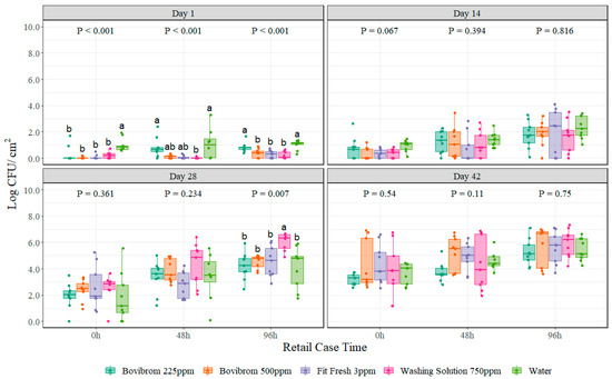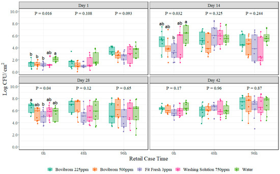 Mesophilic aerobic plate counts (Log CFU/cm2) on pork sections treated with different antimicrobials stored at four different dark storage periods (Day 1, 14, 28, and 42) and then cut into chops and retail displayed for 96 h at refrigerated conditions (n = 9 swabs per treatment/dark storage period/ retail display time). In each boxplot, the horizontal line crossing the box represents the median, the bottom and top box are the lower and upper quartiles, the vertical top line represents 1.5 times the interquartile range, and the vertical bottom line represents 1.5 times the lower interquartile range. (a–b) For each dark storage period and retail display time combination, boxes with different letters are significantly different according to Kruskal–Wallis analysis followed by a Wilcoxon’s pairwise comparison test at p < 0.05. The points represent the actual data points.
