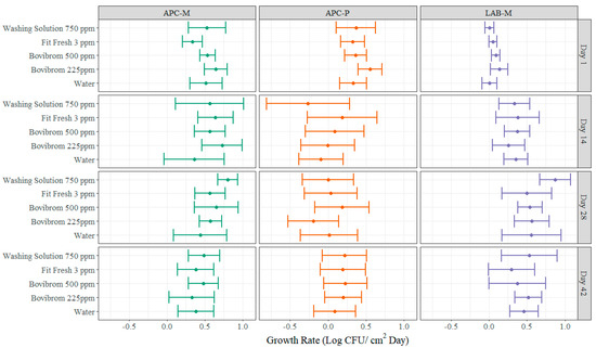 Average (±95% confidence intervals) growth rates (Log CFU/cm2 × Day) for each microbial indicator (APC-M, APC-P, and LAB-M) and treatment (Water, Bovibrom 225 ppm, Bovibrom 500 ppm, Fit Fresh 3 ppm, and Washing Solution 750 ppm) at each dark storage period (Day 1, 14, 28, and 42). The dot represents the average growth rate and the horizontal lines represent the 95% confidence interval.