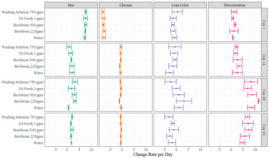 Average (±95% confidence intervals) change rate per day for instrumental and visual color measurements (Hue, Chroma, Lean Color, and Percentage Discoloration) and treatment (Water, Bovibrom 225 ppm, Bovibrom 500 ppm, Fit Fresh 3 ppm, and Washing Solution 750 ppm) at each dark storage period (Day 1, 14, 28, and 42). The dot represents the average change rate of each attribute and the horizontal lines represent the 95% confidence interval.