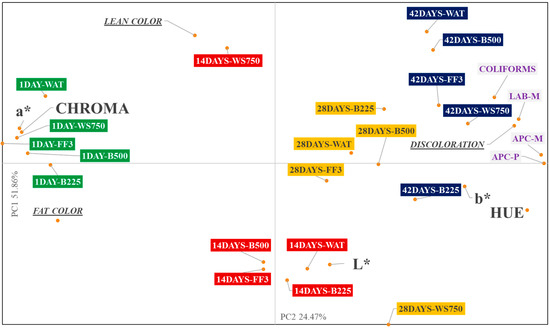 Bi-plot of principal component analysis (PCA) for all microbial and color attributes measured for shelf-life study.