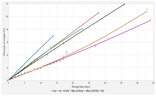 Percentage decrease in weight during storage time. Results are expressed as mean ± SD (n = 4).