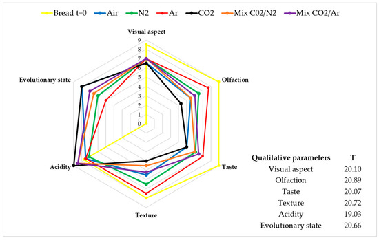 Panel tests were carried out on the slices of bread before packaging (t = 0) and daily, to evaluate the impact of different MAPs on the organoleptic profile of stored bread.