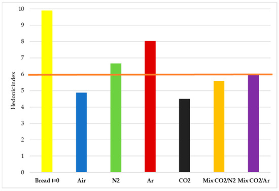 Hedonic index of the bread at time zero and after 8 days of storage in the different MAPs. The orange line indicates the acceptability limit value taken as a reference for this parameter.