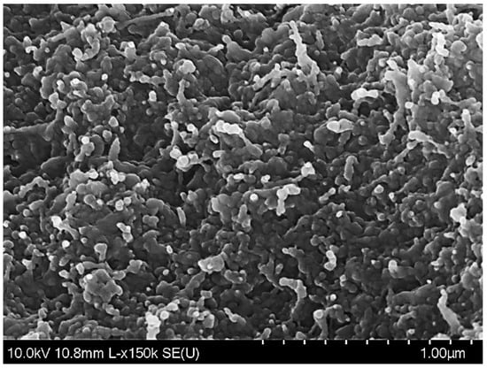 The morphology of freeze-dried co-encapsulated nanoparticles is shown in Figure 2. After lyophilization, most of the particles were clustered together and exhibited approximately elliptic or spherical shapes, with rough surfaces and diameters below 200 nm. This microstructure was different from that reported for resveratrol-loaded nanoparticles, which were predominantly spherical and had smooth surfaces [34], or tannic acid-loaded nanoparticles, which were mostly spherical, but had rough surfaces [28]. Therefore, the results of our SEM analysis suggest that the morphology and aggregation state of the zein nanoparticles was affected by the combined presence of tannic acid and resveratrol during antisolvent precipitation.
