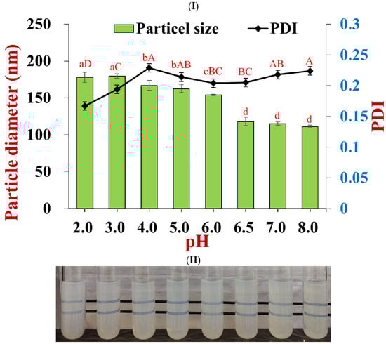 Effect of pH on the stabilities of nanoparticles co-loaded with tannic acid and resveratrol. (I) Particle diameter and PDI at different pH (lowercase statistic notation—particle size; capital statistic notation—PDI, p < 0.05); (II) the appearance of particles at pH values ranging from 2.0 to 8.0.