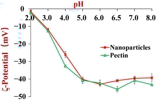 The ζ-potential of tannic acid and resveratrol co-encapsulated zein/pectin nanoparticles at pH values ranging from 2.0 to 8.0.