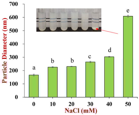 Effect of NaCl concentrations on nanoparticle stability. The inserted photo indicates that the appearance of nanoparticle dispersions changed with NaCl concentrations ranging from 0 to 50 mM (the letter “a–e” represents a statistically significant difference between two groups, p < 0.05).