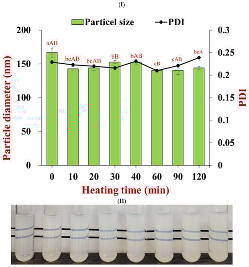 Particle stabilities after heating at 80 °C for 2 h. (I) particle diameter and PDI at different heating times (lowercase statistic notation—particle size; capital statistic notation—PDI, p < 0.05); (II) the appearance of particles after heat treatment.