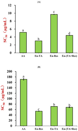 Comparison of the DPPH·(A) and ABTS+· (B) radical scavenging capacities (SC50 values) of nanoparticle co-encapsulated tannic acid and resveratrol (En-(TA+Res)), nanoparticle encapsulated tannic acid (En-TA), nanoparticle encapsulated resveratrol (En-Res), and the physical mixture of tannic acid and resveratrol (PM-(TA+Res)) with the same composition with En-(TA+Res) (the letter “a–d” represents a statistically significant difference between two groups, p < 0.05).