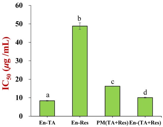 The HepG2 cell toxicity (IC50) of encapsulated tannic acid, resveratrol, and co-encapsulated tannic acid and resveratrol (the letter “a–d” represents a statistically significant difference between two groups, p < 0.05).