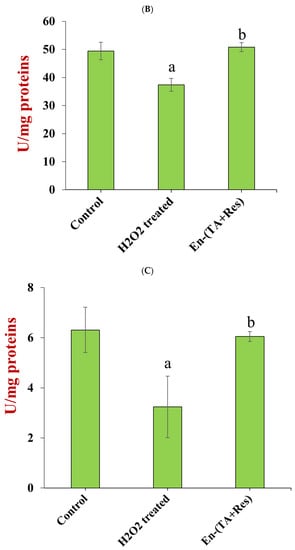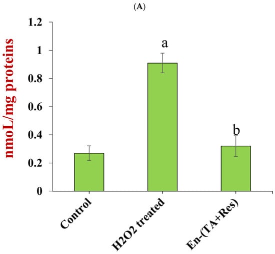 Effect of co-encapsulated tannic acid and resveratrol (En-(TA+Res)) on the concentration of MDA (A), activity of SOD (B), and activity of CAT (C) in HepG2 cells treated with H2O2 (the letter “a,b” represents a statistically significant difference between two groups, p < 0.05).