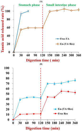 The in vitro bioaccessibility of the co-encapsulated nutraceuticals was assessed by determining the percentage of tannic acid and resveratrol released into the simulated digestion fluids over time. Since tannic acid is soluble in water, free tannic acid was totally released in one hour during stimulated stomach digestion (Figure 10A). Conversely, the release of tannic acid occurred more slowly when it was encapsulated in the nanoparticles. Indeed, only about 59.4% of the tannic acid was released into the gastric fluids after 120 min digestion [28]. This value was about two-fold higher than when tannic acid alone was encapsulated in zein nanoparticles [28], which suggests that the presence of the resveratrol may have impacted the release of the tannic acid under gastric conditions. At the small intestine phase, the tannic acid remaining in the nanoparticles was totally released within the first 30 min of digestion. This value was also higher than the value (about 64%) reported when tannic acid was encapsulated alone in zein nanoparticles [28]. These results show that co-encapsulation with resveratrol increased tannic acid release during stimulated digestion.