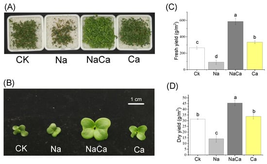 Fresh yield and dry yield of broccoli microgreens under different treatments. (A) Trays of microgreens under different treatments; (B) Leaves of microgreens under different treatments; (C) Fresh yield of microgreens under different treatments; (D) Dry yield of microgreens under different treatments. CK, distilled water; Na, 80 mmol/L NaCl; NaCa, 80 mmol/L NaCl + 1.39 mmol/L CaSO4; Ca, 1.39 mmol/L CaSO4; scale bar = 1 cm. Data are expressed as the mean ± standard deviation (SD), values labelled with different letters are significantly different (p < 0.05).