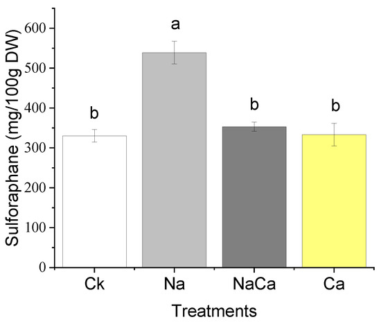 Sulforaphane content of broccoli microgreens under different treatments. CK, distilled water; Na, 80 mmol/L NaCl; NaCa, 80 mmol/L NaCl + 1.39 mmol/L CaSO4; Ca, 1.39 mmol/L CaSO4; DW, dry weight. Data are expressed as the mean ± standard deviation (SD), values labelled with different letters are significantly different (p < 0.05).