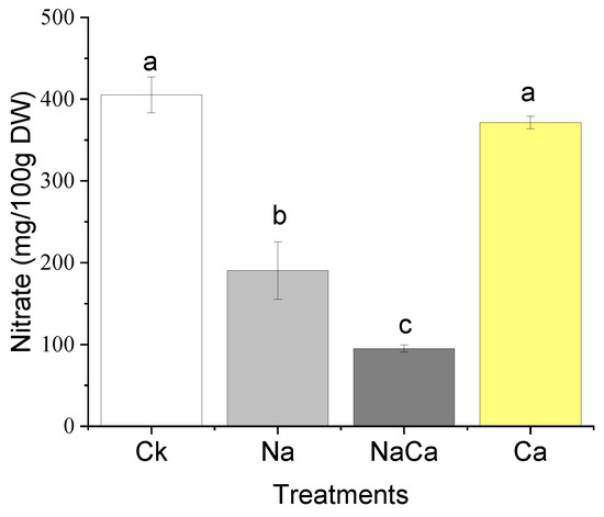 Nitrate content of broccoli microgreens under different treatments. CK, distilled water; Na, 80 mmol/L NaCl; NaCa, 80 mmol/L NaCl + 1.39 mmol/L CaSO4; Ca, 1.39 mmol/L CaSO4; DW, dry weight. Data are expressed as the mean ± standard deviation (SD), values labelled with different letters are significantly different (p < 0.05).
