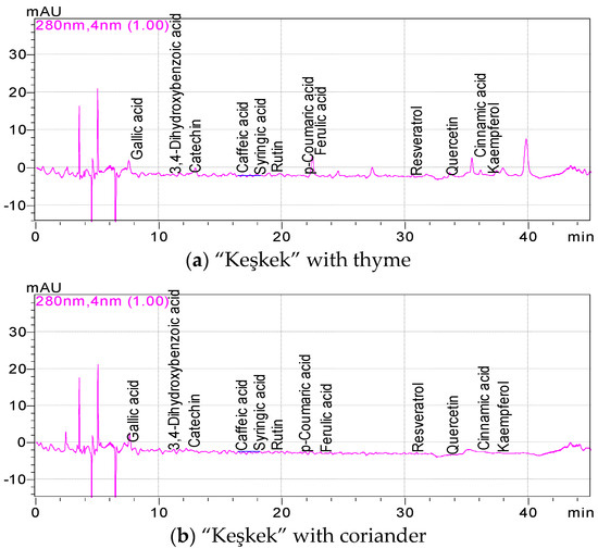The phenolic compounds of “Keşkek” extracts were identified via Shimadzu-HPLC equipped with PDA detector and Inertsil ODS-3 (5 µm; 4.6 × 250 mm) column. Acetic acid (0.05%) (A) and acetonitrile (B) mixtures were used as mobile phase. The flow rate of the mobile phase was 1 mL/min at 30 °C. The injection volume was 20 µL. The peaks were obtained at 280 and 330 nm with PDA detector. The total running time was calibrated as 60 min. Gradient elution was performed for separation and a mixture of 0.05% acetic acid in water (A) and acetonitrile (B) as the mobile phase was used. The flow rate of the mobile phase was 1 mL/min at 30 °C, and the injection volume was 20 µL. The peaks were recorded at 280 and 330 nm using a PDA detector. The total running time per sample was 60 min. Phenolic compounds were determined according to the retention time and absorption spectra of peaks of standard compounds (Figure S1). The total area under peak was used to quantify each of the phenolics.