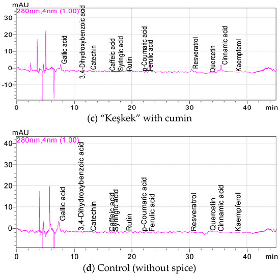 Phenolic chromatograms of control and “Keşkek” samples (a–d) with spice added.