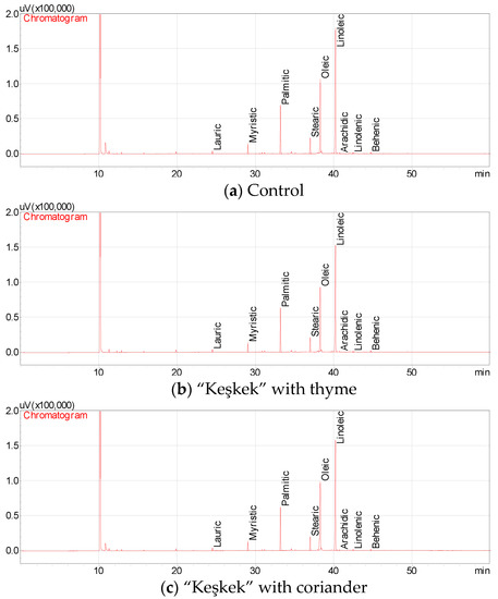 The fatty acid composition and the quantitative values of “Keşkek” samples provided by using thyme, coriander and cumin spice powders are given in Table 3. The dominant fatty acids of “Keşkek” oil samples were myristic, stearic, palmitic, oleic, stearic and linolenic acids (Figure 2). Results changed depending on the addition of spices. Myristic and stearic acids of the oils extracted from “Keşkek” samples were detected between 3.13% (with coriander) and 3.59% (with thyme) to 5.05% (with coriander) and 6.88% (with cumin), respectively. Moreover, the oils of untreated samples and “Keşkek” samples with thyme, coriander and cumin spices contained 15.21%, 16.48%, 14.78% and 18.45% palmitic acids, respectively. While oleic acid amounts of the oils of the “Keşkek” samples were detected as between 25.51% (with thyme) and 30.58% (with cumin), the linoleic acid contents of the oils of “Keşkek” products were identified as between 38.28% (with cumin) and 48.49% (control). The lauric acid amounts of “Keşkek” oils varied between 0.88% (with coriander) and 1.03% (with cumin). The amounts of other fatty acids were found under <0.75% (with cumin). In general, the highest amounts of fatty acids were found in “Keşkek” with cumin, followed by thyme, control (without spice) and “Keşkek” with coriander, in decreasing order. “Keşkek” oils are rich in linoleic acid, followed by oleic, palmitic, stearic and myristic acids, in descending order. Rebey et al. [26] reported that the main fatty acids of the oil of cumin seeds at full maturity were petroselinic acid (55.9%), followed by palmitic (23.82%), linoleic (12.40%) and pamitoleic (2.12%) acids. Coriander vegetable oil contained 2.9% palmitic, 72.7% petroselinic, 6.0% oleic, 13.7% linoleic and 0.2% linolenic acids [27]. Merah et al. [28] reported that cumin seed oils contained 3.9–4.3% palmitic, 47.4–51.6% petroselinic acid, 11.2–12.2% oleic, 30.5–32.9% linoleic and 0.2–0.6% linolenic acids. The results differed from previous fatty acid results with spice fruits or seed oils. These differences may sometimes be due to the fact that the spices are processed into the product and sometimes they are only analyzed in seed oils. Moreover, the differences in the fatty acid components of the “Keşkek” oils may have been due to the added fatty acids in coriander and cumin oil and oils used. This situation is clearly understood from the literature data. The fact that the pancake is rich in linoleic acid shows that this food is also rich in essential fatty acids.