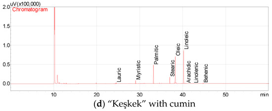Fatty acid chromatograms of the oils of control and “Keşkek” samples (a–d) with spice added.