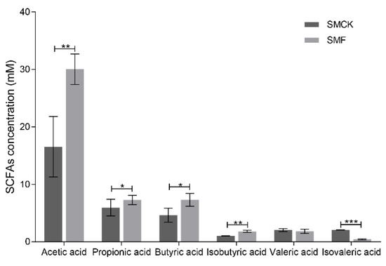 Generally, the determination of SCFAs is essential to evaluate the properties of BSNK-5-fermented soymilk in vitro fermentation [29]. The concentration of total SCFAs and individual SCFA was shown in Figure 1. The SMF samples (49.10 ± 1.71 mmol/L) constituted higher production of SCFAs than the SMCK samples (32.23 ± 5.82 mmol/L) after the in vitro fermentation. Among them, acetic acid (30.19 ± 2.10 mmol/L) accounted for the largest proportion of SCFAs, followed by propionic acid (7.45 ± 0.69 mmol/L) and butyric acid (7.43 ± 0.93 mmol/L). Compared with the SMCK, acetic acid (p < 0.01), propionic acid (p < 0.05), butyric acid (p < 0.05) and isobutyric acid (p < 0.01) showed a significant increase, while isovaleric acid showed a slight decrease (p < 0.001) after the treatment of SMF. These results indicated SMF could induce gut bacteria to produce acetic acid, propionic acid and butyric acid.