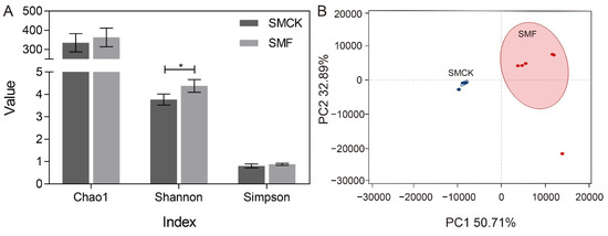 The high-throughput sequencing provided insight into the compositions of the fermented fecal microbiota, which helps elucidate the impact of soymilk fermented by BSNK-5 on microbiota community structures [30,31]. In total, 880,101 clean tags were identified from fecal samples, and each sample had an average of 52,346 valid tags. According to 97% identification threshold, there were 539 operational taxonomical units (OTUs) by clustering the valid tags. Then, alpha diversity was evaluated to measure the intestinal richness and diversity, containing Chao1, Shannon and Simpson index (Figure 2A). The Chao1 index shows the microbial richness in samples. The Shannon and Simpson index show the community diversity [15,32]. After the in vitro fermentation, the Shannon index of SMF samples exhibited higher than that of SMCK group (p < 0.05), accompanied by a slight increase in Chao1 and Simpson index. The Shannon index indicated that bacterial diversity was increased. It suggested SMF was conducive to the growth of bacterium and improved the diversity. The principal component analysis (PCA) was utilized to reveal the beta diversity. The first and second axes (PC1: 50.71%, and PC2: 32.89%) interpreted 85.6% of the total variance (Figure 2B). The SMF and SMCK could be clearly separated from each other, indicating SMF caused different clustering of fecal microbiota compositions.