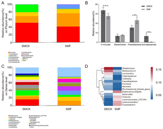 The relative abundances of the intestinal microbiota in the SMF and SMCK groups was examined at the levels of phylum and genus. At the phylum level (Figure 3A), the most dominant phylum was Firmicutes, followed by Proteobacteria, Bacteroidota, Actinobacteriota and Fusobacteriota. When compared to the intestinal microbiota samples in SMCK, Firmicutes (41.56%) and Actinobacteriota (0.57%) became less abundant. Conversely, Proteobacteria (34.68%) and Fusobacteriota (11.33%) were significantly more abundant in SMF. The SMF could down-regulate the ratio of Firmicutes/Bacteroidota from 4.95 to 3.61 (Figure 3B). The relative abundance on the genus level was shown in Figure 3C, the key genus was notably shaped by SMF supplementation, Streptococcus, Collinsella, Prevotella, Bifidobacterium, Lactobacillus had a notable decrease, while Lachnospiraceae_UCG-004, Bacteroides, and Sutterella were enriched in comparison with SMF and SMCK. Among them, Streptococcus was one of the common pathogenic bacteria; Lachnospiraceae_UCG-004 was SCFAs-producing bacteria. These results were supported by the heatmap of genus-level abundance (Figure 3D). These results suggested BSNK-5-fermented soymilk was beneficial for the gut microecosystem.