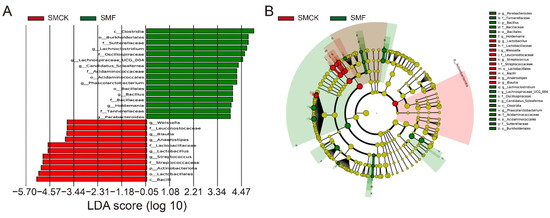 Comparisons of difference microorganisms between the SMCK and SMF groups using LEfSe. (A) Linear discriminant analysis (LDA) score, (B) LEfSe evolutionary branch graph. The diameter of the node was proportional to the relative abundance. The node in each layer represented the phylum/class/order/family/genus from the inside to the outside, and the annotations of the species labels were opposite; different letters corresponded to different species.