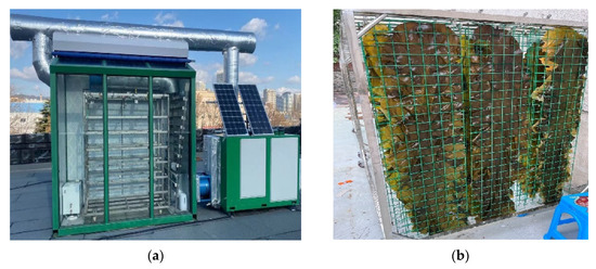 Photos of the proposed SHPD (a) and the geometric arrangement of the kelp for drying (b).