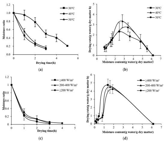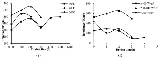 Variations in MRs and drying rates under the conditions of different irradiances (400 W/m2, 200−400 W/m2, or 200 W/m2) and drying temperatures (30, 40, or 50 °C) in S−HP mode are shown in Figure 3. The moisture content was reduced to 18% (w.b.) in 3−5 h and increases in irradiance or drying temperature were found to be conducive to the reduction in drying time. Compared with that of S−HP ≥ 400 W/m2, the drying time of S−HP 200−400 W/m2 and S−HP ≤ 200 W/m2 was prolonged by 33%. There was no significant difference between the drying rate at 50 °C and that at 40 °C (p < 0.05), but both were significantly higher than that at 30 °C. This is similar to the results of the research by Moot et al. [24] on solar drying for alfalfa. The penetration depth of strong and weak solar irradiation differed, leading to a nearly 10 times difference in the drying rate.