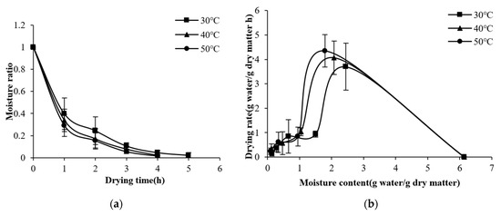 Variations in MRs and drying rates in HP mode under the conditions of different drying temperatures (30, 40, or 50 °C) are shown in Figure 4. The drying time of kelp HP was between 4−5 h and would be reduced as the temperature increased. The drying time was 20% shorter at 40 °C and 50 °C than at 30 °C. The drying rate was relatively high at the early drying stage and positively regulated by the temperature. Moreover, the drying rate decreased as the moisture content decreased, and the limiting factor changed from surface diffusion control to internal migration control, so there was almost no difference in drying rate at different temperatures at the late drying stage [25]. There was no obvious constant-speed stage during the kelp drying. This may be due to the rapid evaporation on the surface of kelp, which makes it difficult to form a stable water concentration difference between the surface and the interior of kelp [26]. The results were consistent with the pattern observed by Zhang et al. [9] in the HP for small-sized kelp slices, though the drying time of the proposed SHPD was shortened by 2–7 h. In addition, when the temperature was 40−50 °C, the drying time of HP was 33% longer than that of S−HP, and the average drying rate was 7.3% lower, indicating that solar irradiation could significantly improve the drying rate of kelp.