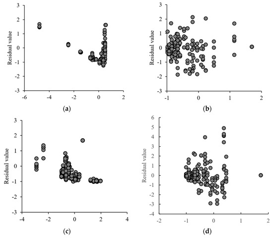 Residual plots of the Henderson−Pabis model (a), the Page model (b), the Wang and Sing model (c), the Lewis model (d) for all groups.