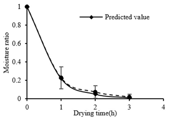 Multi-heat transfer drying is a complex process of heat and mass transfer. The MRs of kelp drying under different drying conditions were fitted to the above-mentioned three models (Table 5). The results show that the correlation coefficients of the Page model ranged from 0.873 to 0.999, and the average values of RMSE and χ2 (0.06, 0.02, respectively) were closer to 0, indicating that the Page model was better than the other three models in describing the changing process of the moisture content.