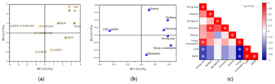 Principal component analysis (PCA) was performed on all variables to further investigate the association between the system performance and kelp drying quality (Figure 7). The cumulative contribution of the first two principal components accounted for 76.4%, meaning that they explained 76.4% of the drying effects. PC1 mainly accounted for the system performance information. Compared with HP groups, S−HP groups had unparalleled energy-saving advantages and could effectively shorten the drying time. The S−HP 40 °C (S−HP ≥ 400 W/m2) group showed the best energy-saving performance. In addition, energy consumption, COP and SMER show a strong correlation with drying time (Figure 7c). PC2 mainly showed the texture and sensory properties of the dried kelp. The sensory and textural qualities of the S−HP groups and the HP groups were comparable to each other overall, and the sensory qualities of the S−HP 40 °C and HP 40 °C groups were the best.