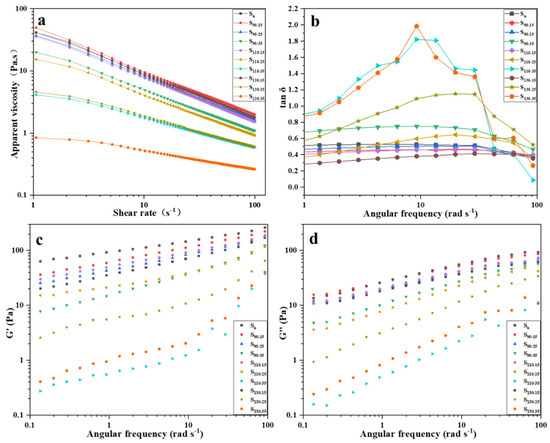 Rheological properties of native and HMT HB flours. (a) Apparent viscosity of HB flour gel; (b) tan δ; (c) storage modulus; (d) lose modulus. Sn indicates native HB flour; S90−15, S90−25, S90−35 indicate that the heating temperature of HB flour is 90 °C; S110−15, S110−25, S110−35 indicate that the heating temperature of HB flour is 110 °C; S130−15, S130−25, S130−35 indicate that the heating temperature of HB flour is 130 °C; S90−15, S110−15, S130−15 indicate that the moisture content of HB flour is 15%; S90−25, S110−25, S130−25 indicate that the moisture content of HB flour is 25%; S90−35, S110−35, S130−35 indicate that the moisture content of HB flour is 35%; G′, storage modulus; G″, loss modulus; tan δ, loss tangent.