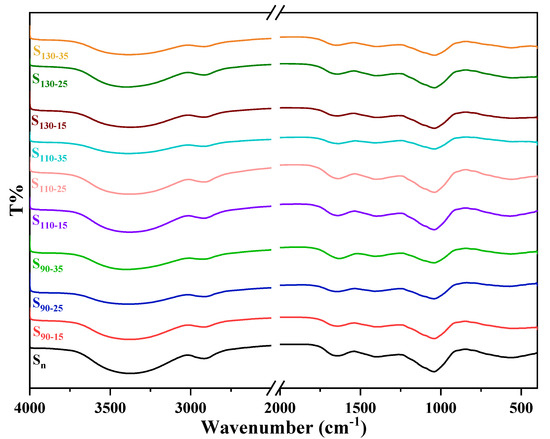 FTIR spectra of native and HMT HB flour. Sn indicates native HB flour; S90−15, S90−25, S90−35 indicate that the heating temperature of HB flour is 90 °C; S110−15, S110−25, S110−35 indicate that the heating temperature of HB flour is 110 °C; S130−15, S130−25, S130−35 indicate that the heating temperature of HB flour is 130 °C; S90−15, S110−15, S130−15 indicate that the moisture content of HB flour is 15%; S90−25, S110−25, S130−25 indicate that the moisture content of HB flour is 25%; S90−35, S110−35, S130−35 indicate that the moisture content of HB flour is 35%; T%, transmittance (%).
