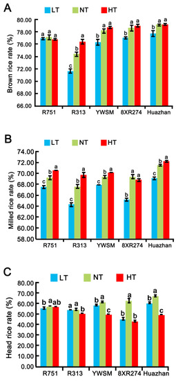 Milling quality is usually evaluated by indicators such as brown rice rate, milled rice rate, and head rice rate. To examine the effect of improper temperatures at the grain-filling stage on the milling quality of grains from restorer lines, we measured and compared the three indicators of the grains harvested after different temperature treatments. As shown in Figure 1A, the brown rice rate of the restorer line R751 was affected neither by HT nor LT; and YWSM, 8XR274, and Huazhan exhibited unchanged brown rice rates upon HT treatment at the grain-filling stage. However, LT decreased the brown rice rate of the latter three restorer lines by 2.30%, 2.04%, and 1.77%, respectively (Figure 1A). R313 was shown to be the most vulnerable variety among those tested, as its brown rice rate was reduced significantly by LT (3.63%) and increased by HT (2.69%). It was shown that LT during the grain-filling stage had a greater negative effect than HT on the brown rice rate of most varieties except for the resistant line R751.