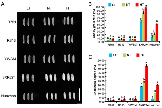 Moreover, under HT at the grain-filling stage, the chalkiness degree and chalky grain rate of 8XR274 were increased by 84.39% and 14.83%, respectively (Figure 2B,C). HT increased the chalkiness degree and chalky grain rate of Huazhan dramatically by 106.06% and 136.45%, respectively (Figure 2B,C). The results showed that HT further caused grain chalkiness increases in varieties with poor appearance quality, which is consistent with previous research on conventional rice or hybrid rice combination varieties [9,20,21,22,23]. However, our research further identified three restorer lines of hybrid rice whose appearance quality was unaffected by HT or LT. The chalkiness degree or chalky grain rates of R751, R313, and YWSM under HT and LT showed no significant differences compared with those under NT (Figure 2). Overall, R751, R313, and YWSM possessed better appearance quality than the other two restorer lines, and these desirable characteristics were unlikely to be affected by temperature stress.