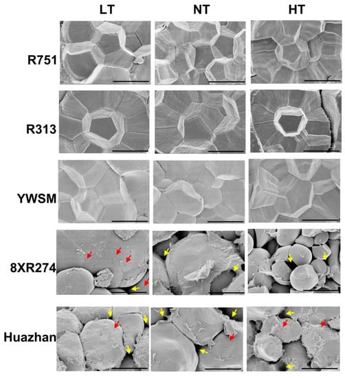 The formation of chalk usually accompanies abnormal starch granule morphology, including incompletely filled starch granules with many air spaces in between that are visible as opaque spots along the translucent grain [36]. In order to intuitively observe the morphological characteristics, including the arrangement compactness of starch granules in rice grains, we examined horizontal slices of grains via scanning electron microscopy instead of isolated starch obtained after the rice grains were ground into powder, as reported in a previous study [4]. In the grains of R751, R313, and YWSM treated with LT, NT, or HT at the filling stage, the starch granules were semi-crystalline and tightly packed, and the shapes of starch granules were polygonal with sharp edges (Figure 3). However, in the grains of 8XR274 and Huazhan, the starch granules were loosely packed with many air spaces and were nearly round in shape, lacking edges and corners, for each temperature treatment that the grains experienced during endosperm development (Figure 3). More air spaces in between starch gains and many small spherical granules existed in 8XR274 grains under HT. Dense pits were frequently observed on the surfaces of starch granules in Huazhan grains grown under HT (Figure 3), which is consistent with previous studies concerning the effect of high temperatures on starch granules [26,35]. However, the influence of LT on starch granule morphology of 8XR274 and Huazhan was not as strong as that of HT (Figure 3). This is consistent with our previously observed effects of LT on the chalkiness degrees of 8XR274 and Huazhan, being less than those of HT to some extent (Figure 2). HT and LT increased the chalkiness degrees of 8XR274 by 84.39% and 27.42%, respectively. For Huazhan, HT and LT increased the chalkiness degree by 106.06% and 65.66%, respectively (Figure 2). As a qualitative technique, using SEM analysis it was difficult to show the effect of LT on the morphology of starch particles (Figure 3). Overall, the fine starch granule morphologies of R751, R313, and YWSM were unaffected by suboptimal temperatures, whereas the starch granules of 8XR274 and Huazhan exhibited abnormal morphology, especially under HT.