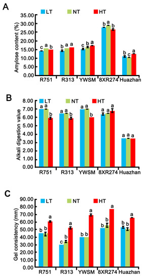 Apparent amylase content (A), alkali digestion value (B), and gel consistency (C) of five restorer lines under LT (low temperature), NT (normal temperature), and HT (high temperature). Data are shown as mean ± standard error of triplicate measurements. Different letters are added above standard deviation to express significant difference (p < 0.05).
